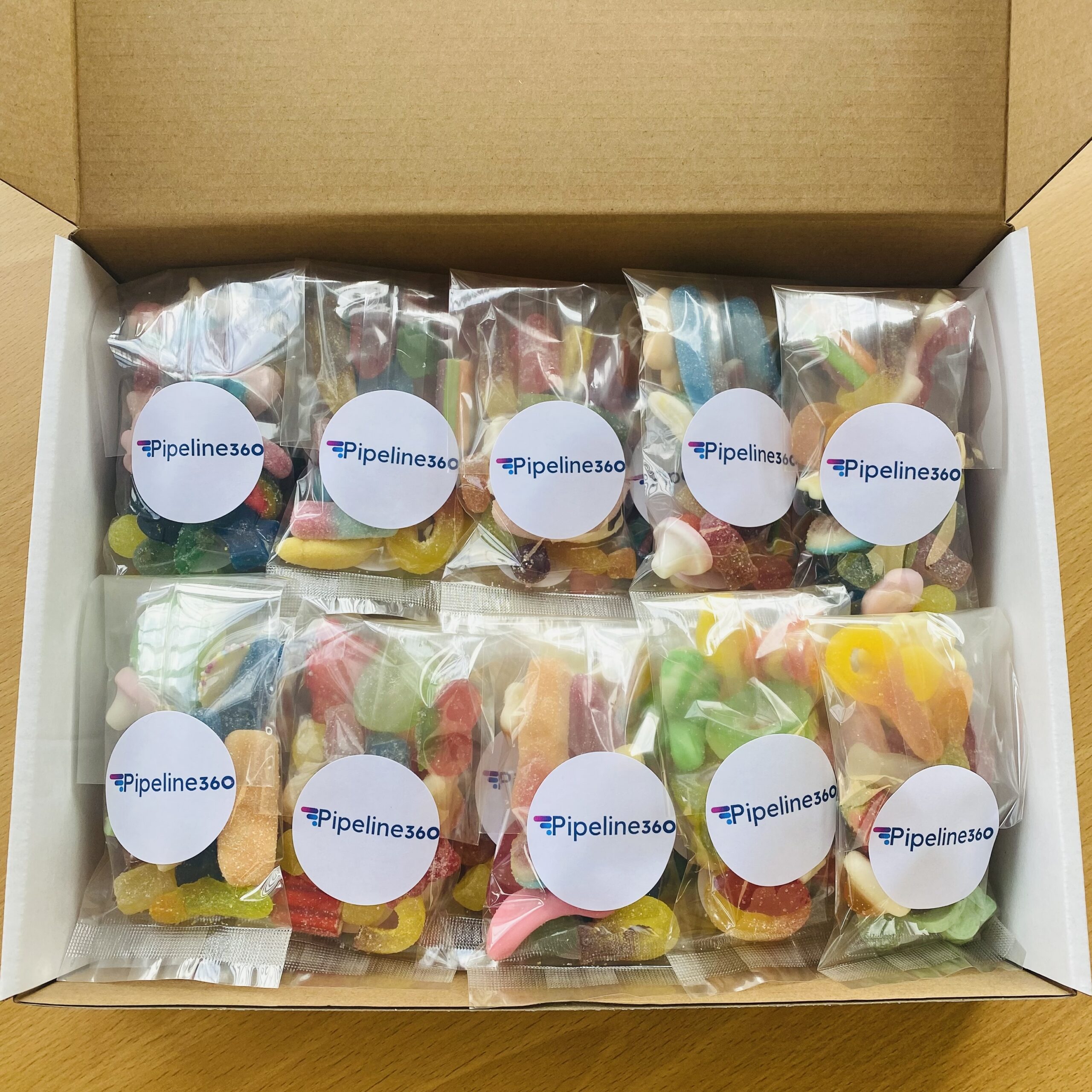 Elevate your brand and make a lasting impression with our hamper, filled with 20 small eco bags of our delicious pick and mix treats. Perfect for any team or office, each bag features your company’s branding for that thoughtful, personal touch!